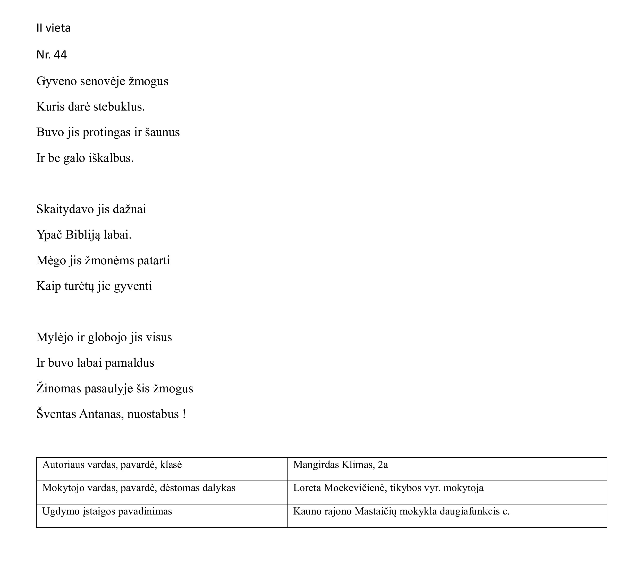 Kasparas Žėkas, Marijampolės šv. Cecilijos gimnazijos 2 klasės mokinys, kurio eilėraštis „Šv. Antanai, saugok mus“ Facebook paskyroje surinko 214 balsų. Kasparą kūryboje lydėjo pradinių klasių mokytoja Ramutė Murauskienė.