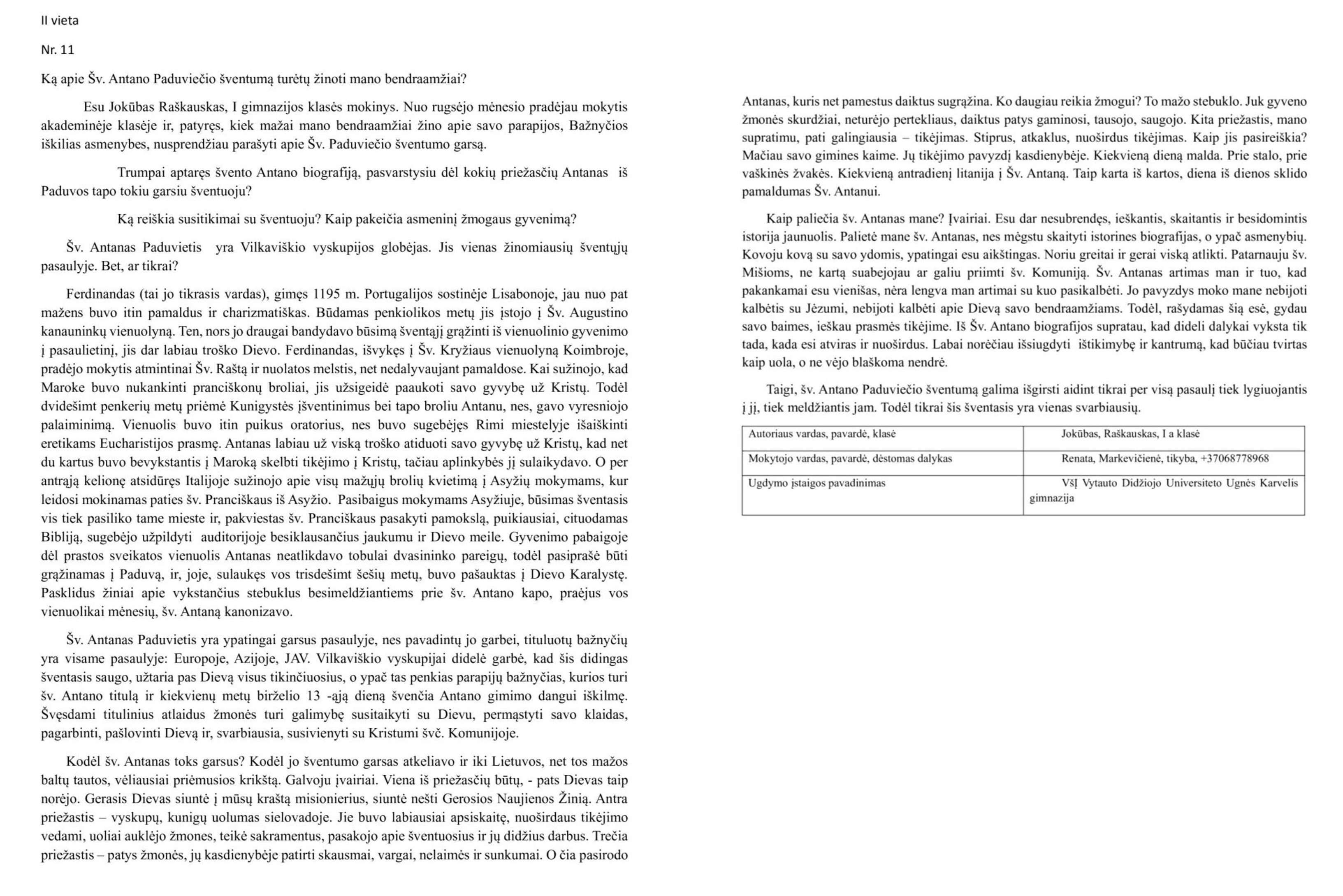 II vietą laimėjo Jokūbas Raškauskas, VšĮ Vytauto Didžiojo Universiteto Ugnės Karvelis gimnazijos I gimn. klasės mokinys. Jokūbo tikybos mokytoja Renata Markevičienė.